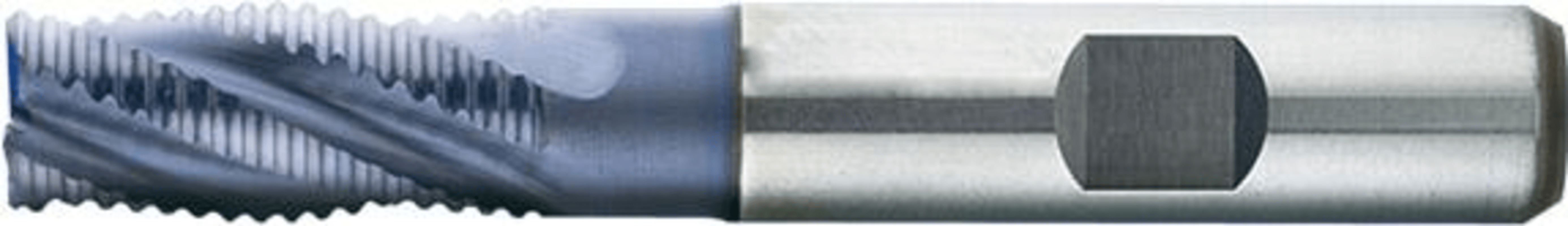 Schruppfräser, TiAlN-beschichtet• Ausführung: kurz • HSS-Co8 • Typ NR • 4 Schneiden • DIN 844-K • DIN 1835-B • Schruppverzahnt • Drallwinkel 30° • Zum Umfangs- und Bohrfräsen • Stirn-, se