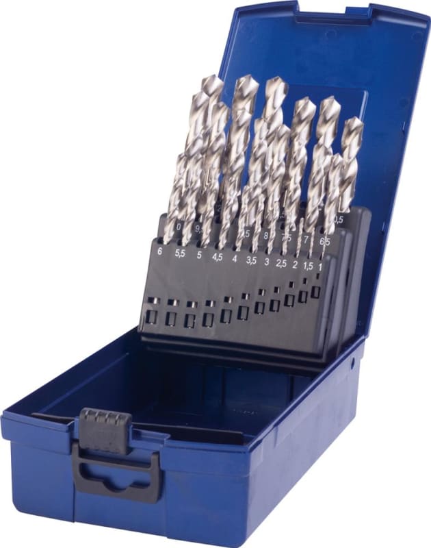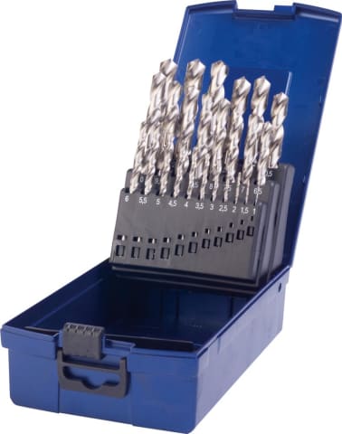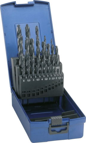 Spiralbohrer-Satz, dampfbehandelt• HSS • DIN 338 • Typ N • Spitzenwinkel 118° • Spiralwinkel 25–30° • Seitenspanwinkel, Kerndicke und Kernanstieg normal • Schaft zylindrisch • Rechtsschneidend
