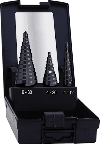Universal-Stufenbohrer-Satz, TiAlN-beschichtet• HSS • Durchmesser in der Nut lasersigniert • 2 Schneiden • Kantenbrecher • Gerade genutet • Durchrutschen im Bohrfutter wird durch 3-Flächenschaft
