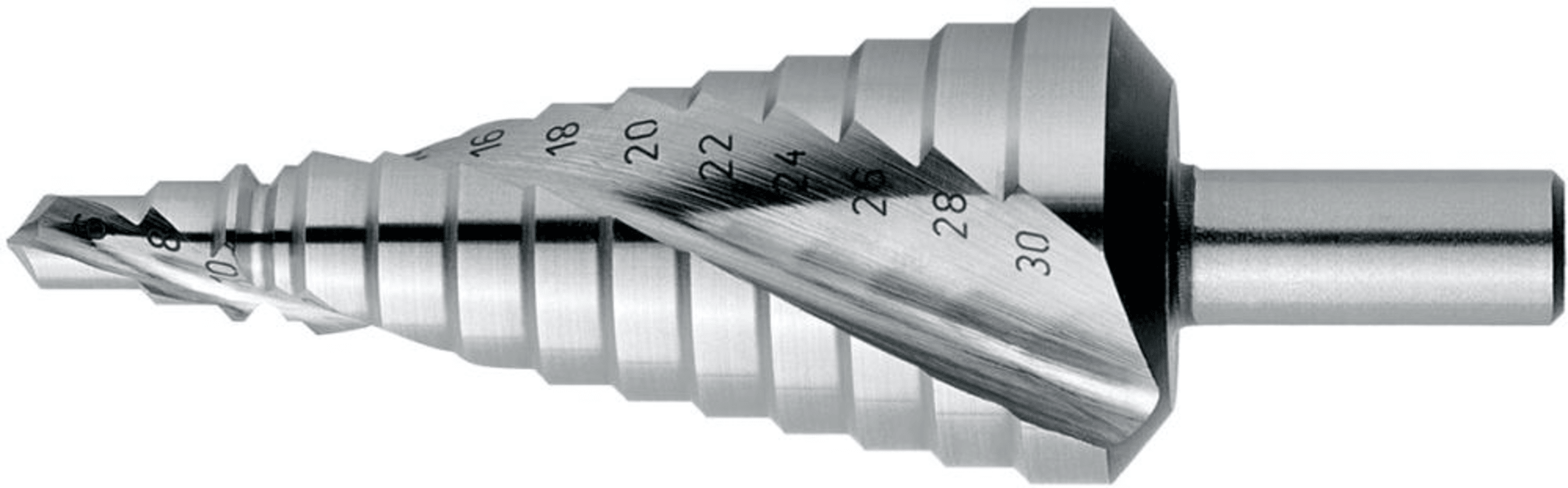 Universal-Stufenbohrer, blank• Werksnorm • HSS • Lasersignierung der Loch-Ø und Drehzahlen • 2 Schneiden • Kantenbrecher • Spiralgenutet • Durchrutschen im Bohrfutter wird durch 3-Flächenschaft