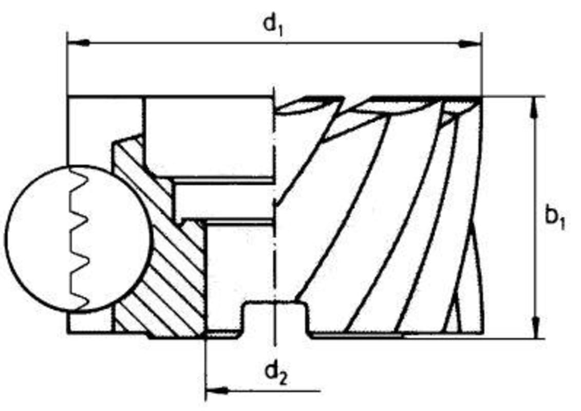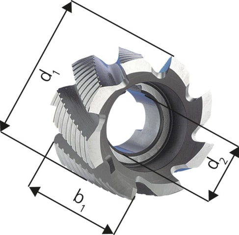 Walzenstirnfräser, blank• HSS-Co5 • DIN 1880 • Profilhinterschliffen • Zylindrische Bohrung mit Längs- und Quernut nach DIN 138 • Drallwinkel 25° • Spanwinkel 14° • Geeignet als Plan-, Eck- un