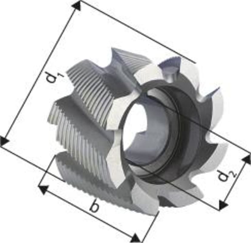 Walzenstirnfräser, blank• HSS-Co8 • DIN 1880 • Schruppfräser mit feiner Verzahnung, Typ HR • Zylindrische Bohrung mit Längs- und Quernut nach DIN 138 • Drallwinkel 25° • Spanwinkel 14° • Prof