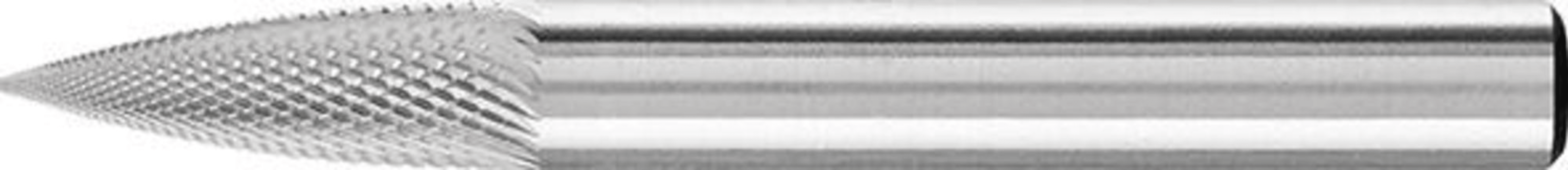 HM-Frässtift SPG, Spitzbogenform, Zahnung MICR • Speziell für die Feinbearbeitung mit höhere Abtragsleistung und Oberflächengüte in Bereichen, wo normalerweise Schleifstifte verwendet werde • Für sehr feine Putzarbeiten, Korrekturen im Werkzeug- und Formenbau und dem Schärfen von Schnittwerkzeuge • Geeignet für die Bearbeitung von Stahl, Guss, rostfreiem Edelstahl sowie hartem NE-Metall und hochwarmfestem Metall bis zu einer Härte von 68 HRC