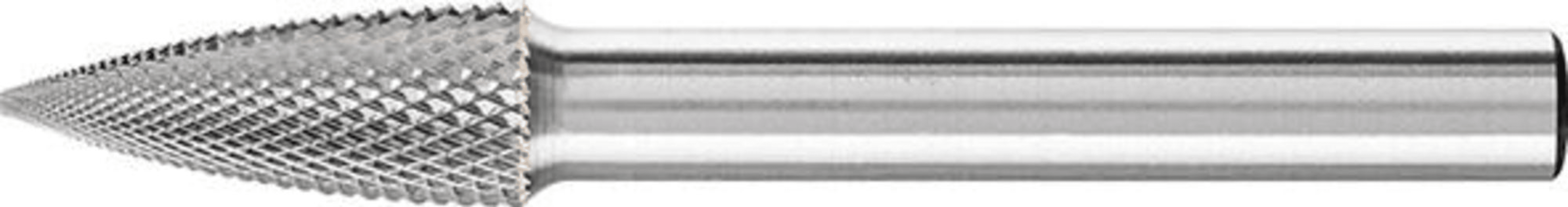 HM-Frässtift SPG, Spitzbogenform, Zahnung MICR • Speziell für die Feinbearbeitung mit höhere Abtragsleistung und Oberflächengüte in Bereichen, wo normalerweise Schleifstifte verwendet werde • Für sehr feine Putzarbeiten, Korrekturen im Werkzeug- und Formenbau und dem Schärfen von Schnittwerkzeuge • Geeignet für die Bearbeitung von Stahl, Guss, rostfreiem Edelstahl sowie hartem NE-Metall und hochwarmfestem Metall bis zu einer Härte von 68 HRC