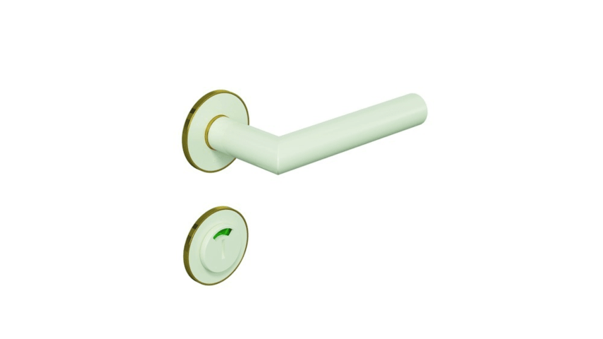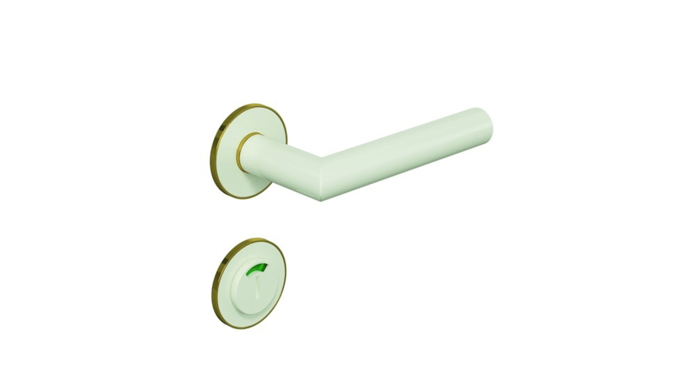 Flache Drücker- und WC-Rosetten, 306.23PBVINR..., rund, Durchmesser 52 mm, 4,0 mm hoch. Verdeckte, lockerungssichere Verbindung: Drücker und Rosetten sind festdrehbar vormontiert, sowie in das Türblatt eintauchende Stützzapfen. Einfache und schnelle Montage durch Einrasten vormontierter Baugruppen. WC-Ausführung mit Notöffnung mittels Münze und wahlweise mit bzw. ohne Schauscheibe (Anzeige rot/grün) auf der Außenseite.