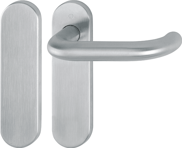 Edelstahl-Feuerschutz-Kurzschild-Garnitur (Türgriff-Garnitur): geprüft nach DIN 18273. Türgriffe für Hoppe-Steckgriff-Verbindung. Schilder mit Stahl-Unterkonstruktion und Stütznocken, wartungsfreies G
