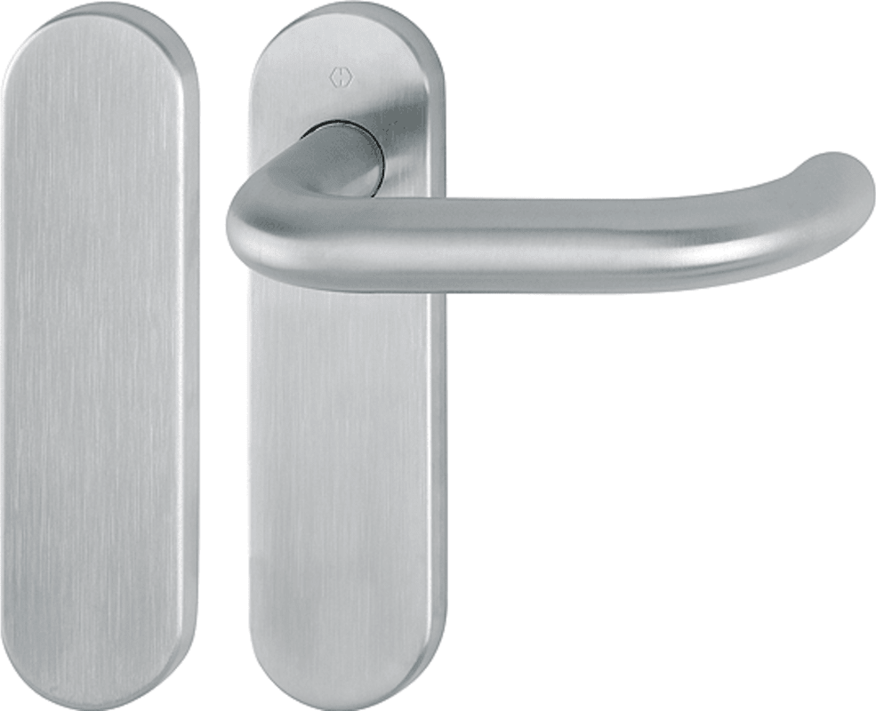 Edelstahl-Feuerschutz-Kurzschild-Garnitur (Türgriff-Garnitur): geprüft nach DIN 18273. Türgriffe für Hoppe-Steckgriff-Verbindung. Schilder mit Stahl-Unterkonstruktion und Stütznocken, wartungsfreies Gleitlager für Türgriffe, Hoppe-Profilvollstift mit Klemmfeder zum Toleranzausgleich in der Schlossnuss, aufklippbare Abdeckschilder, verdeckte, lockerungssichere Verschraubung mit durchgehenden Gewindeschrauben.