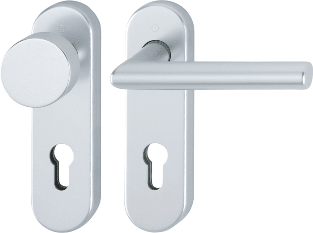 Aluminium-Feuerschutz-Kurzschild-Wechsel-Garnitur für Wohnungsabschluss-Türen Amsterdam. • Lagerung: außen Knopf fest, innen Türgriff fest/drehbar, Rückholfeder, HOPPE-Steckgriff-Verbindung mit Kugel