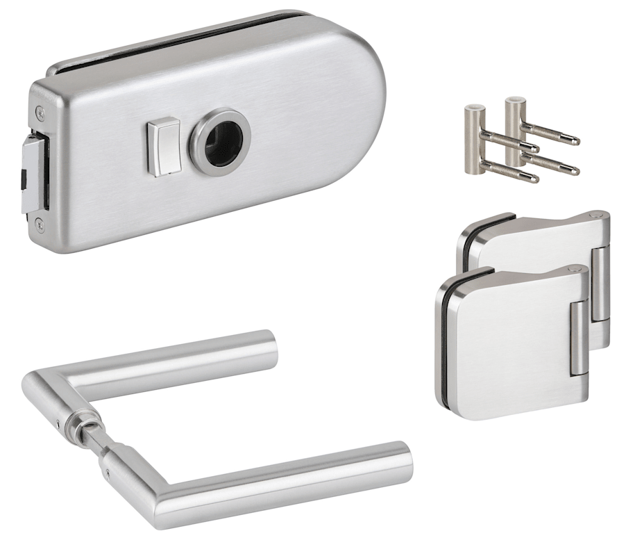 Glastür-Schlosskasten 6016 F BAD - Venezia Verstellbar Universell Ls/Rs-mit rot/weiß Anzeige inkl. Bandpaar 6315P-60 & Rahment. Holzzarge und Drückerpaar 1802-60 Oberfl. 60 (Edelstahl matt)