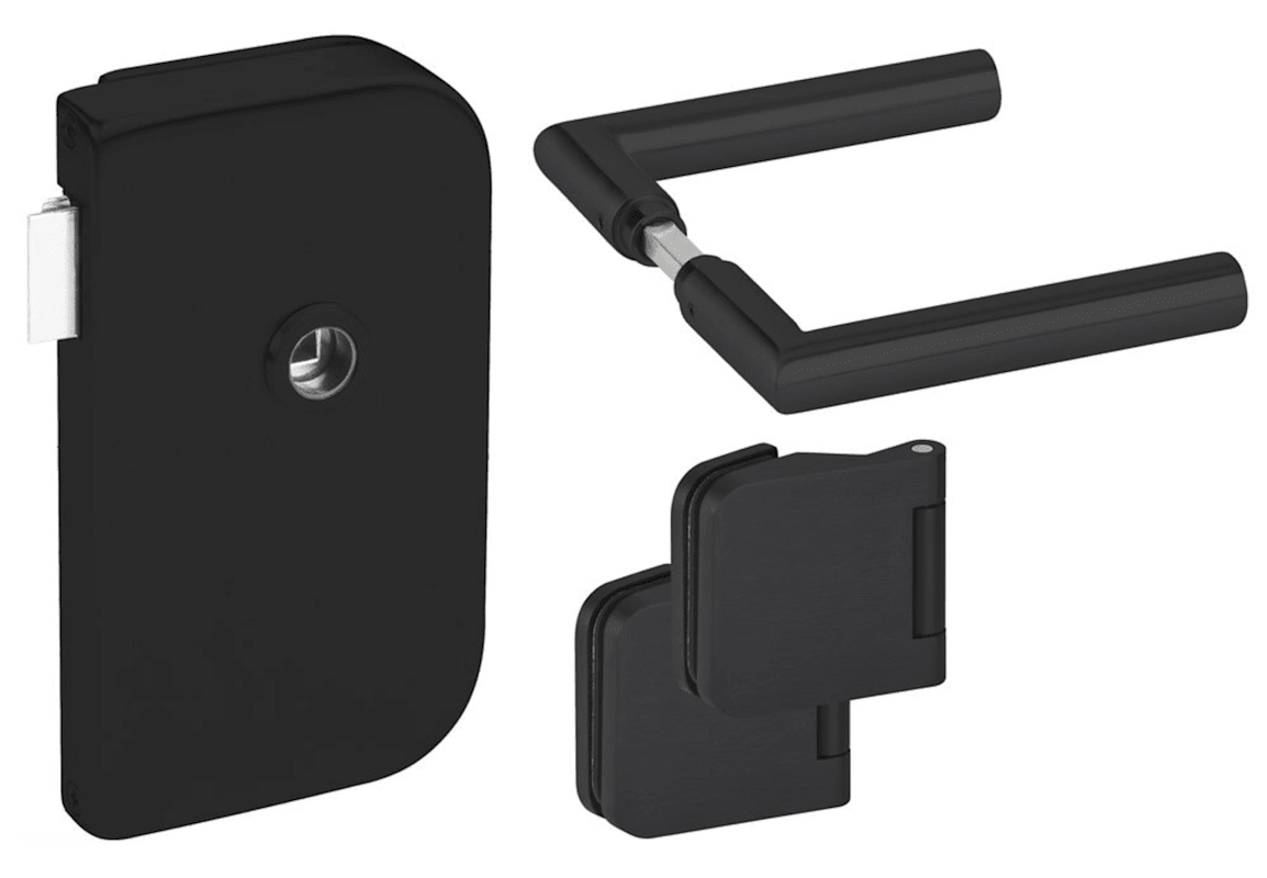 Glastür-Schlosskasten 6031 OL - Roma, ohne Lochung - DIN rechts, inkl. Bandpaar 6315, und Drückerpaar 1802, Oberfl. 74 (Classic black, ähnl. RAL 9005)