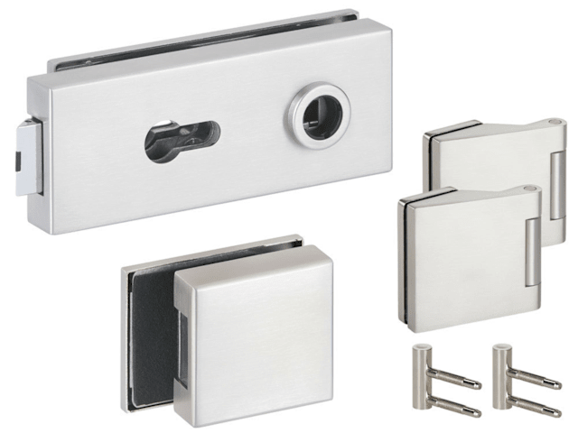Glastür-Schlosskasten 6073 PZ - Treviso, & Gegenkasten 6074 GKS, inkl. Bandpaar 6325-20 & Rahment. Holzzarge, und Feststeller 6009.C/6610.F + Schnäpper 6702, Oberfl. 20 (Edelstahlfarben)