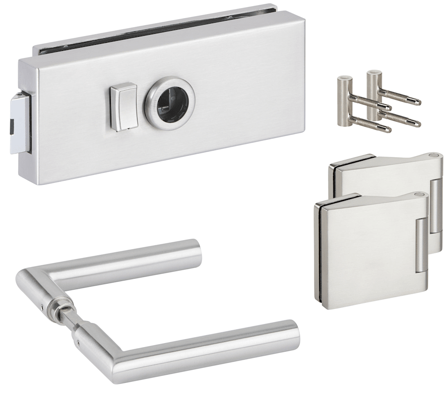 Glastür-Schlosskasten 6076 F BAD - Treviso Verstellbar Universell Ls/Rs-mit rot/weiß Anzeige inkl. Bandpaar 6325-20 & Rahment. Holzzarge Drückerpaar 1802-60 Oberfl. 20 (Edelstahlfarben)
