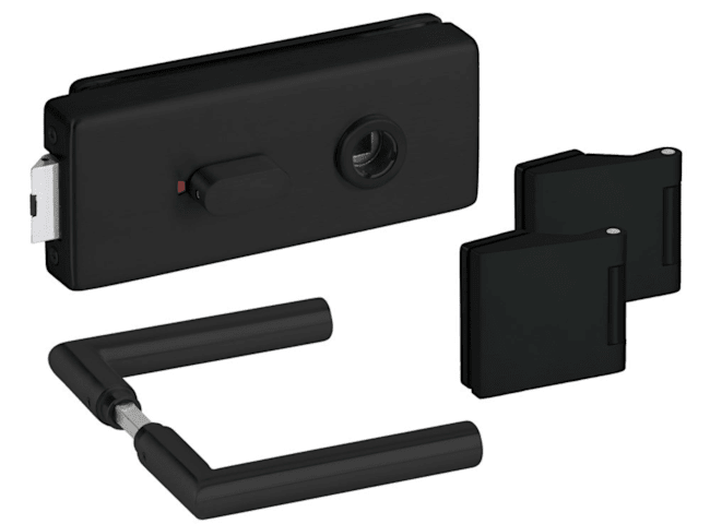 Glastür-Schlosskasten 6086 BAD - Genova, Verstellbar Universell Ls/Rs-mit rot/weiß Anzeige, inkl. Bandpaar 6325, und Drückerpaar 1802, Oberfl. 74 (Classic Black, ähnl. RAL 9005)