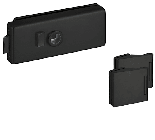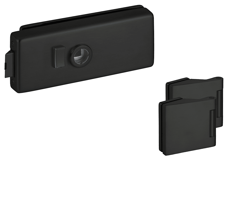 HERMAT Ganzglastürschloss Genova 6086/6325; Produkttyp: Ganzglastürschloss; Produkttyp (Hersteller): Glastürschloss-Set; Ausführung: mit Drückerführung; Verriegelung: manuell; Drückerposition: hinten; Form: eckig; Drückernuss: Klemmnuss; Material: Aluminium; Schlosskastenbreite: 66 mm; Schlosskastenlänge: 159 mm; Glasart: ESG; Norm: DIN EN 12209; Einsatzbereich: Glastür; Türart: Anschlagtür; Lochung: WC Schauscheibe/Schlitzkopf; DIN-Richtung: DIN Links-Rechts; Farbe: schwarz; Farbton: classic black; RAL Farbton: ähnlich RAL 9005; Oberfläche Schlosskasten: matt; Ausführung Falle: mit Flüsterfalle; Glasstärke: 8 mm