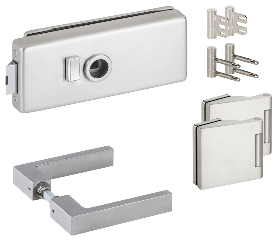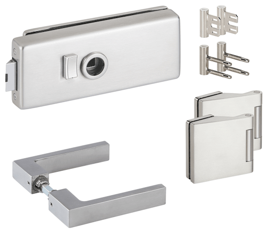 Glastür-Schlosskasten 6086 F BAD - Genova Verstellbar Universell Ls/Rs-mit rot/weiß Anzeige mit Bandpaar 6325P-60, Rahment. Holz u. Stahlzarge und Drückerpaar 1682.L-60 Oberfl. 60 (Edelstahl matt)