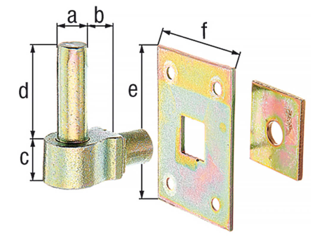 GAH Alberts Kloben; Ausführung: ohne Stütze; Material: Stahl; Oberfläche: galvanisch gelb verzinkt; Befestigungsart: zum Durchschrauben; Basis: Kloben; Form: kantig; Anzahl Schraublöcher: 4St.; Schraublochdurchmesser: 6,4mm; Schraublochausführung: Senkkopf; Material Haken: Stahl; Dornstärke: 20mm; Plattenbreite: 80mm; Durchmesser metrisches Gewinde: M16; Einsatzbereich: Ladenband; Farbe: gelb; Dornlänge: 60mm; Plattenhöhe: 110mm