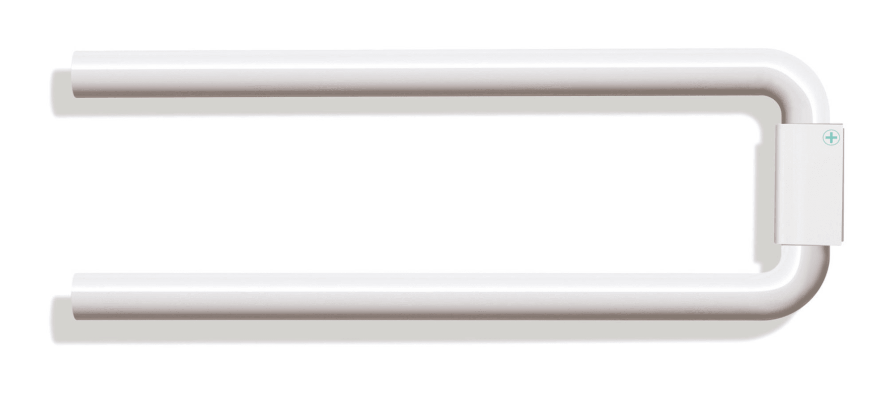 Handtuchhalter mit zwei übereinander angeordneten, zylindrischen Haltearmen, 446 mm lang und 160 mm hoch, Durchmesser der Haltearme 28 mm, inklusive korrosionsfreiem HEWI Befestigungsmaterial, aus hochwertigem Polyamid in HEWI Farbe 98 (Signalweiß), mit antimikrobiell wirksamen Mikrosilber.