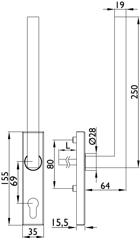 Hebe-Schiebetürgriff 1835 SQUARE, 180° Rasterung / mit PZ Lochung, verdeckte Verschraubung, mit Vierkantst. 10 x 95 mm u. Schrauben M6 x 80 mm, Oberfl. 60 (Edelstahlfarben matt)