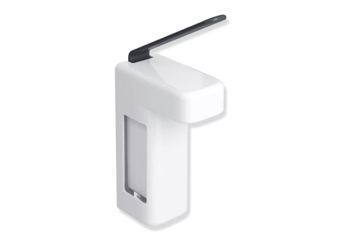 HEWI disinfectant/soap dispenserBody made of high-gloss polyamide in HEWI colour 98 (signal white), operating lever made of high-gloss polyamide, for 500 ml Euro standard bottles, including 500 ml emp