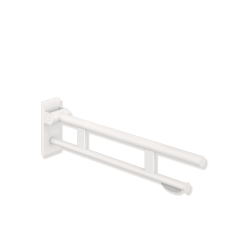 two parallel, vertically arranged round handle levels, made of high-quality stainless steel, powder-coated in the HEWI colours DX (White deep matt), DC (Black deep matt) and SC (Dark grey pearl matt), with mobile toilet paper holder, for retrofitting on mounting plate 900.50.00160, (to be ordered separately), projection 750 mm, 210 mm high, 101 mm wide, upper rail diameter: 33.7 mm, lower rail diameter: 25 mm, load capacity up to 100 kg, produced in accordance with CE and UKCA Regulation (EU) 2017/745 on medical devices. Complies with the requirements valid in Belgium (CWATUPE, WVG Vlaanderen) regarding the projection of the support folding handle on the toilet.