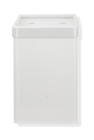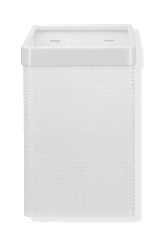 Rectangular container made of perforated sheet metal with a plastic top, used as a waste bin for used paper towels, 305 mm wide, 515 mm high and 300 mm deep, white perforated sheet metal, made of high-quality polyamide according to the HEWI colour chart, including corrosion-free HEWI fixing material.