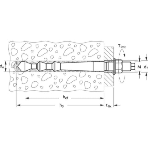In the anchor rod FHB II-A S, the drill diameter is equal to the thread diameter. This allows for through-bolt installation without the need for tools and reduces mortar consumption.
