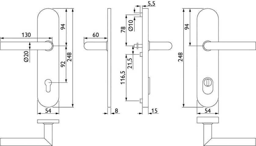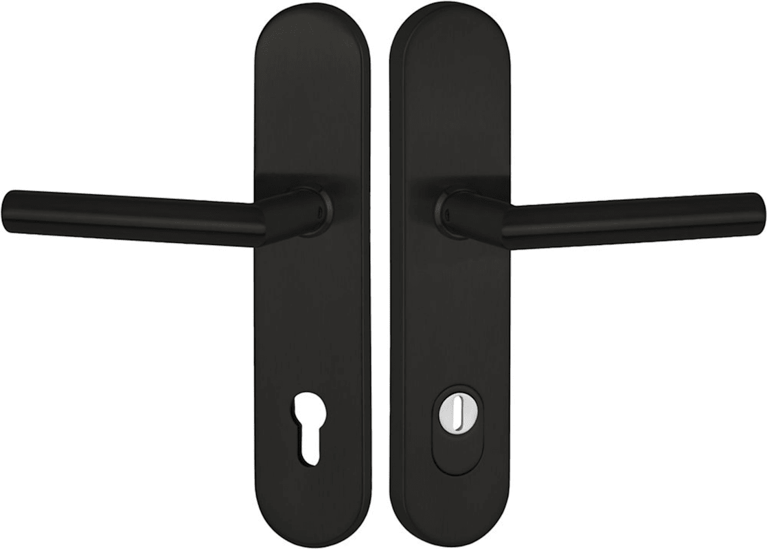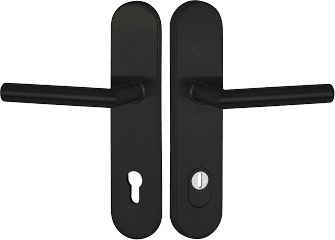 HT-EN2-Schutz-Drückergarnitur 1802 BASIC 02, mit Langschild 2089 KSH, Ausf.: PZ 92 mm, Türstärke 64 - 83 mm, mit Kernziehschutz für Zylinderüberstand 8 - 15 mm, Oberfl. 74 (Classic Black, ähnl. RAL 90