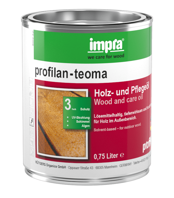 Tief eindringender Wetterschutz auf Basis pflanzlicher Öle. Anwendungsgebiete: profilan®-teoma wird bevorzugt zum Schutz und zur Nachpflege von Gartenholz, Holzfassaden und Holzdecks aus Hart- und Na