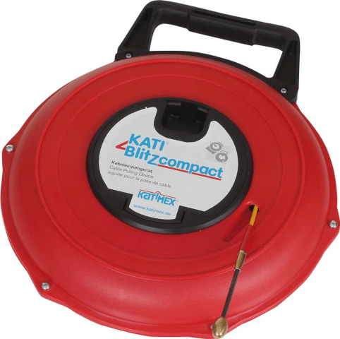 Kabeleinziehgerät Kati®-Blitz Compact• Glasfiber-Einziehband aus Polykat® • Anfangshülse 2.0 an beiden Bandenden • Innenliegende, drehbare Speichertrommel, zum Einspulen des Bandes Lieferung: Mit