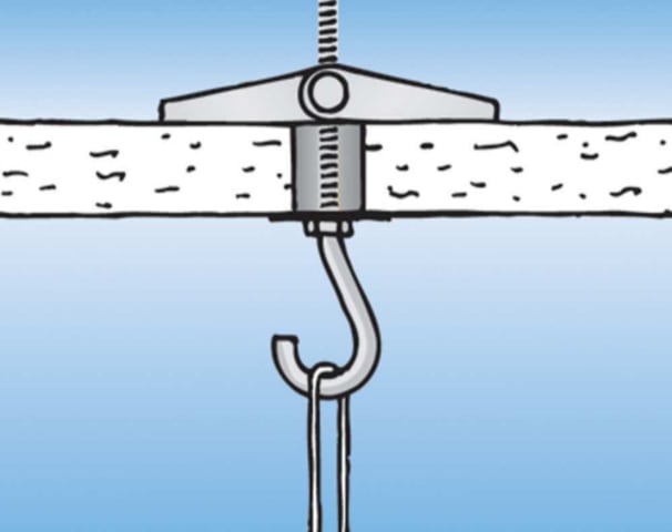 Mit dem fischer Federklappdübel KDH können beispielsweise Leuchten in Gipskarton- und Gipsfaserplatten, Spanplatten und Hohldecken aus Ziegelstein und Beton befestigt werden. Der Federklappdübel wird
