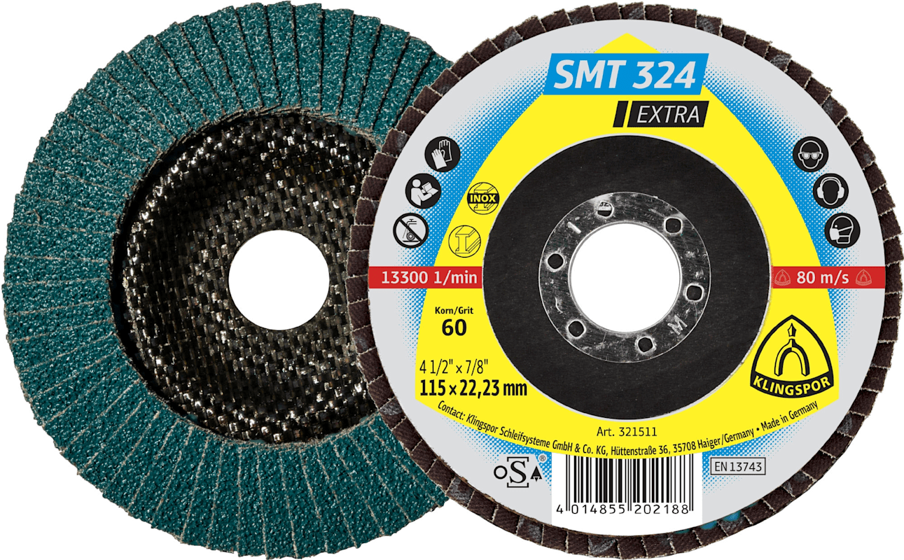 Fächerschleifscheibe SMT 324, gewölbtSchleifmopteller • Zirkonkorund • Glasgewebeteller • Für Kanten- und Flächenbearbeitung auf Stahl und Edelstahl • Für die Entfernung von Schweißnähten und Grat