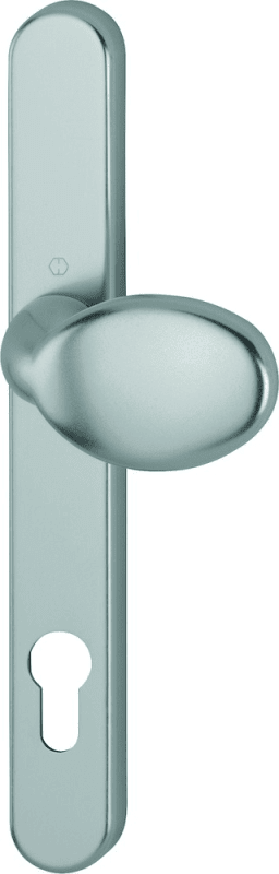 HOPPE® Knopf 76G/3347N; Material: Aluminium; Befestigungsart: verdeckt verschraubt; Befestigungstechnik: mit Stütznocken; Abdeckung: auf Schmalschild; Lagerung: fest; Form Abdeckung: oval; Schildstärke: 10 mm; Einsatzbereich: Haustür; Basis: Knopf; Knopfhöhe: 50 mm; Farbton: stahlfarbig; Türart: Rahmentüren,Außentüren; Türwerkstoff: Kunststoff,Aluminium; Türstärke max.: 82 mm; Türstärke min.: 72 mm; Breite: 30 mm; Länge: 245 mm; Knopfform: gekröpft; DIN-Richtung: DIN Links-Rechts; Lochung: Profilzylinder gelocht; Entfernung: 92 mm; Vierkant: 8 mm; Befestigungssystem: Stiftverbindung; Knopfbreite: 90 mm; Material Unterkonstruktion: Zamak