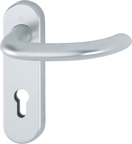 Aluminium-Kurzschild-Türgriff-Garnitur für Innentüren Marseille. • Lagerung: Türgriffe fest/drehbar, Rückholfedern, HOPPE-Steckgriff-Verbindung Kugel-Arretierung Sertos®, wartungsfreie Gleitlager • Ve