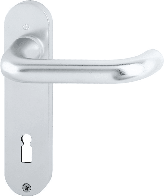 Aluminium-Innentür-Kurzschild-Garnitur geprüft nach DIN EN 1906 (Benutzungskategorie 3). Türgriffe mit Hoppe-Schnellstift-Verbindung, Schilder sichtbar verschraubt.