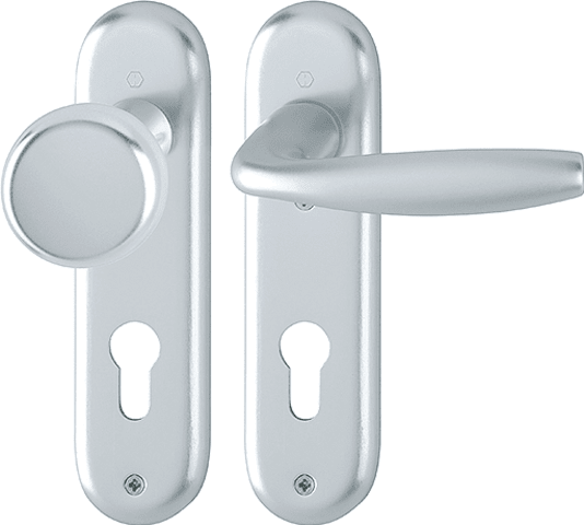Aluminium-Innentür-Kurzschild-Garnitur geprüft nach DIN EN 1906 (Benutzungskategorie 3) Türgriffe mit Hoppe-Schnellstift-Verbindung und Rückholfeder, Schilder sichtbar verschraubt.