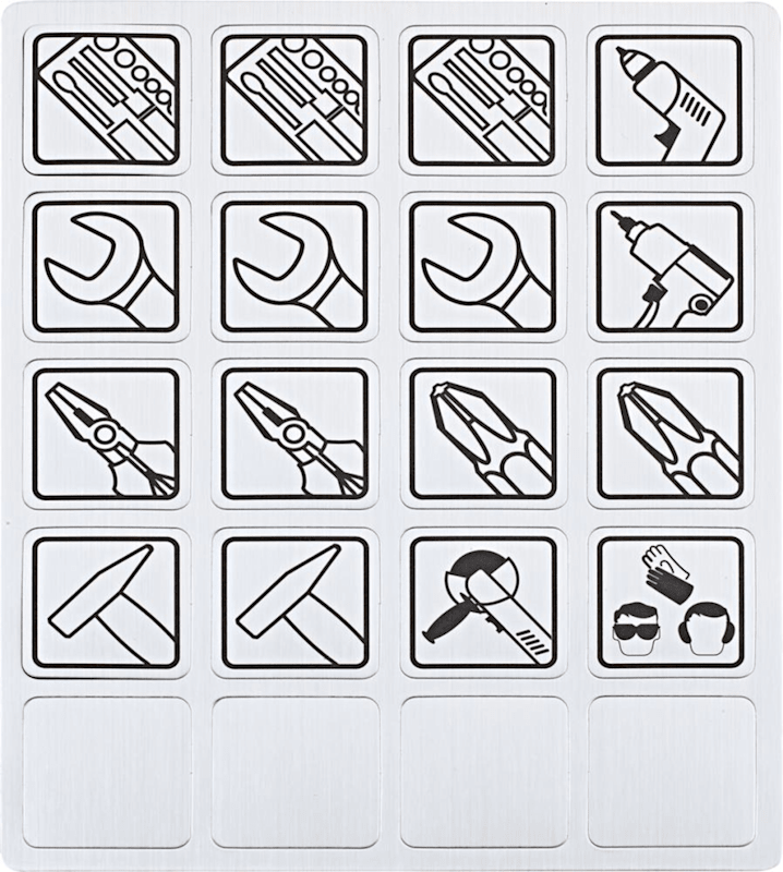 • Mit Symbolen der 16 gängigsten Werkzeuge und 4 Blanko Etiketten zum individuellen Beschriften