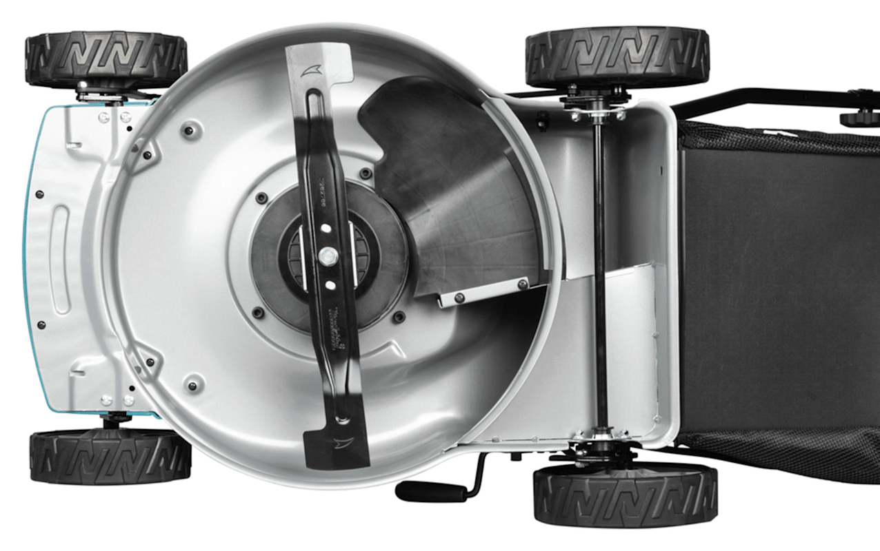 Geräuscharmer 2x 18V Akku-Rasenmäher mit robustem Stahldeck für große Rasenflächen. Einschaltbarer Leise-Modus für ein geräuschempfindliches Umfeld. Füllstandsanzeige am 60 Liter Grasfangkorb. Mit Akk
