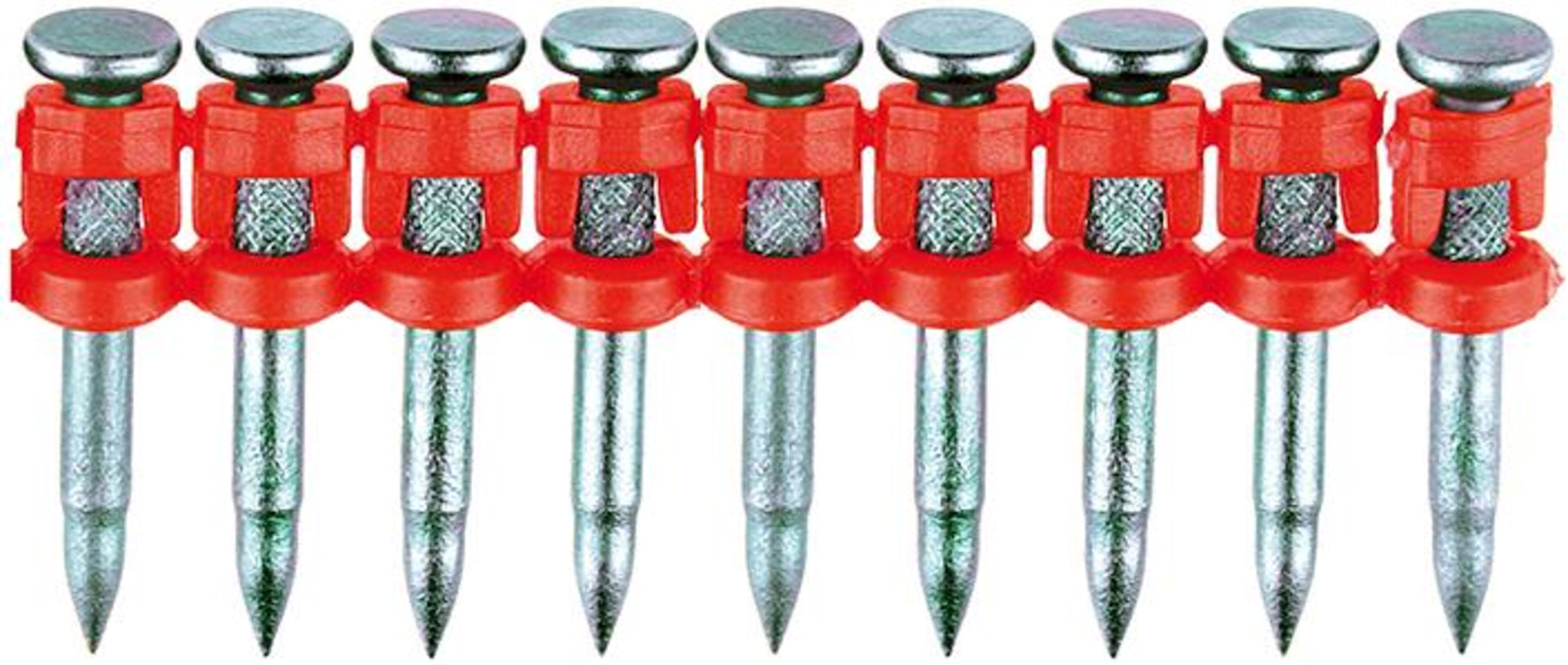 FORCE ONE-Premiumnagel XH Produkteigenschaften • Blan • Gerillter Schaft für besseren Hal • Für Gasnagler FORCE ON • Auch für harten Beton und Stahl geeigne • Mit Gaskartusche für 800 Näge • Kurzer Nagel mit 13 mm Länge ist speziell gehärtet für Stahl
