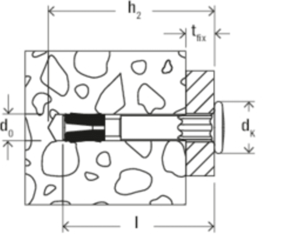 Der fischer Nagelanker FNA II 6 mit Nagelkopf wird aus galvanisch verzinktem Stahl hergestellt. Der FNA II wird mit wenigen Hammerschlägen zeitsparend in der Durchsteckmontage gesetzt. Bei Belastung s