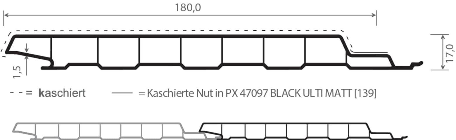 Nut- u. Federprofil 180x17 mm Lg. 6,00 m foliert, VE: 30 m mit folierter Nut in PX 47097 BLACK ULTI MATT [139] 72 5105-167 LICHTGRAU [70]