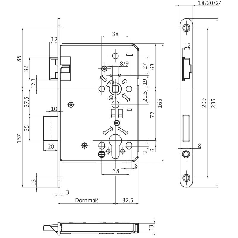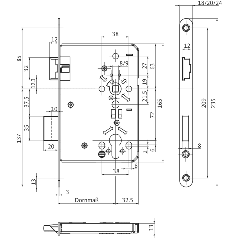 Objektschloss B-0515 nach DIN 18251, Klasse 3. Eigenschaften: • Anzahl Türflügel: 1-flügelig • Für Elemente aus: Holz-/Stahltüren • Funktion: Normalfunktion • Einsatzbereich: Standardtüren • Verriege