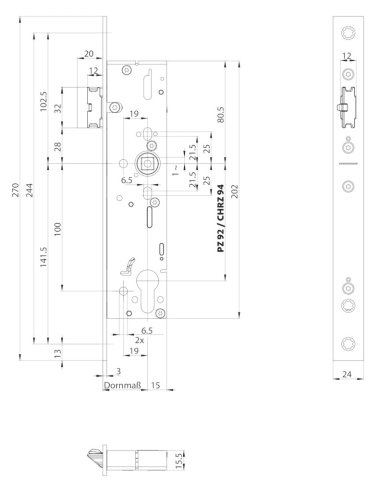 BKS Panik-Einsteckschloss B-19110; Produkttyp: Panik-Einsteckschloss; Produkttyp (Hersteller): Selbstverriegelndes Panikschloss; Ausführung: mechanisch; Verriegelung: selbstverriegelnd (automatisch); Entriegelung: manuell; Drückernuss: geteilte Nuss; Stulpform: Flachstulp; Material Stulp: Edelstahl; Funktion Anti Panik: Umschaltfunktion B; Ausführung Riegel: Fallenriegel mit Auslösehebel; Schlosskasten: offen; Schlosskastenhöhe: 202 mm; Schlosskastenstärke: 15,5 mm; Norm: DIN EN 12209,DIN EN 1125,DIN EN 179; Zulassung: für Feuerschutz,für Fluchttüren,für Rauchschutz; Türart: Rohrrahmen; Türflügelanzahl: zweiflügelig; Türwerkstoff: Aluminium,Stahl; Einsatzbereich: Gangflügel; Dornmaß: 35 mm; Drückernussvierkant: 9 mm; Entfernung: 94 mm; Lochung: Schweizer Rundzylinder gelocht; DIN-Richtung: DIN Links-Rechts; Stulpausführung: kantig; Stulpbreite: 24 mm; Stulplänge: 270 mm; Stulpstärke: 3 mm; Farbton Stulp: edelstahl; Oberfläche Stulp: matt; Zusatzfunktion-/Ausstattung: Überwachungsfunktion; Einbautiefe Schlosskasten: 47 mm; Wechsel: ohne Wechsel