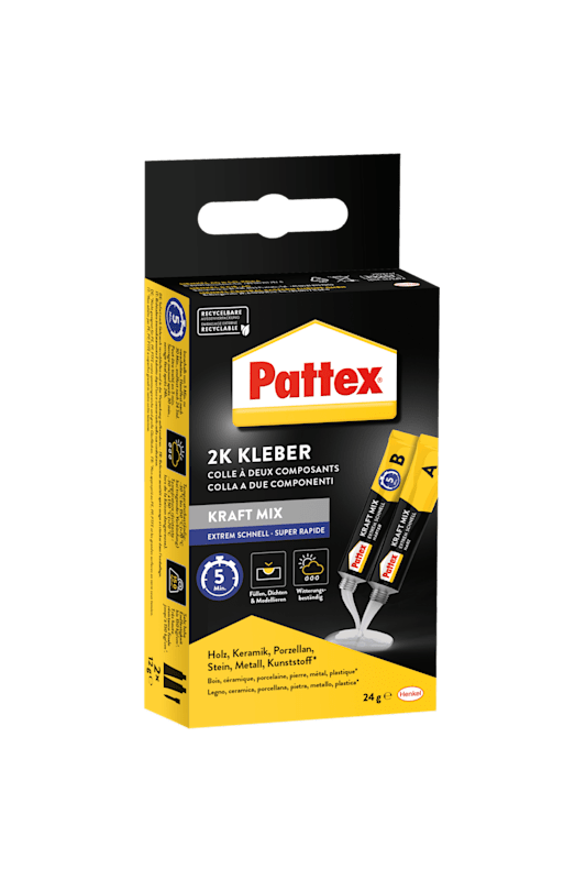 Das Pattex 2-Komponenten-Epoxidharz Kraft-Mix Extrem Schnell erlaubt schnelle und anspruchsvolle Verklebungen.
