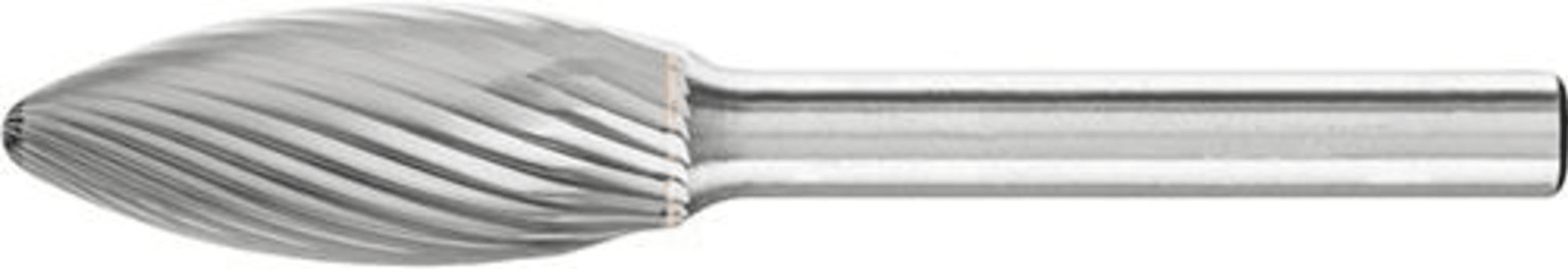 HM-Frässtift B, Flammenform, Zahnung 3• Hoher Materialabtrag • Gute Oberfläche • Für die Bearbeitung von Stahl, Guss, Leicht- und NE-Metallen