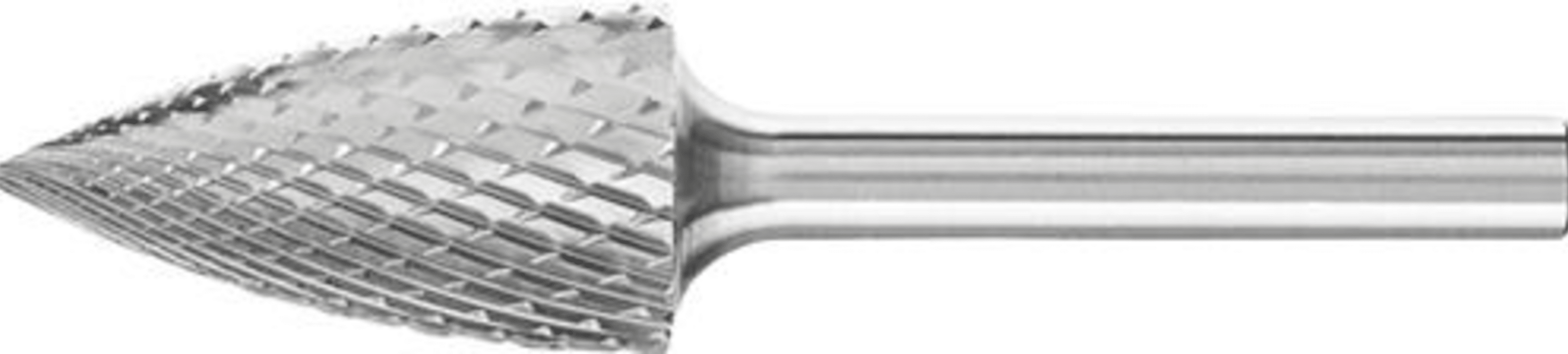 HM-Frässtift SPG, Spitzbogenform, Zahnung 4• Hoher Materialabtrag mit kurzen Spänen • Gute Oberfläche • Für die Bearbeitung von Stahl < 60 HRC, Edelstahl (INOX) und hochwarmfesten Werkstoffen