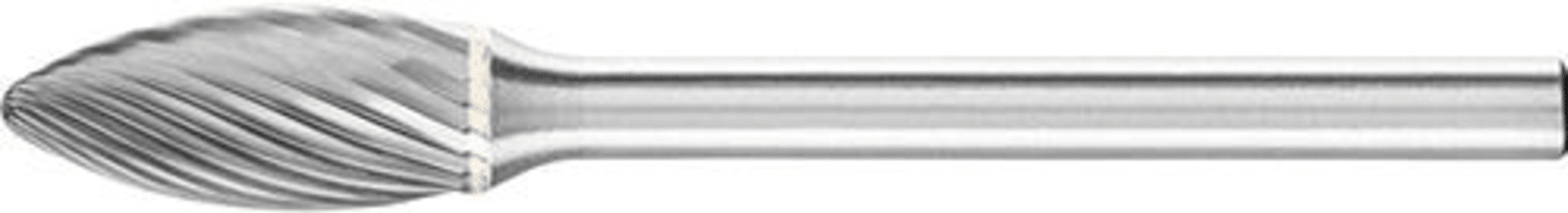 HM-Kleinfrässtift B, Flammenform, Zahnung 5• Gute Oberfläche • Für die Bearbeitung von Stahl < 60 HRC, Edelstahl (INOX), Gusseisen und hochwarmfesten Werkstoffen wie Nickelbasis- und Kobaltbasislegi