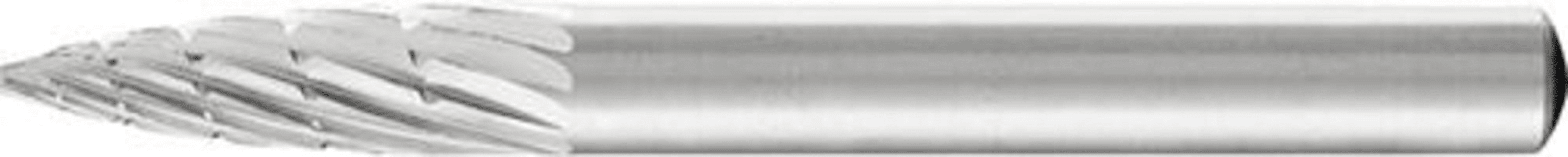 HSS-Frässtift K, Spitzbogenform, Zahnung 3• Mit Spanbrecher • Hohe Aggressivität • Im niedrigen Drehzahlbereich einsetzbar • Sehr stabile Zahnschneiden • Für die Bearbeitung von Stahl, Stahlguss u