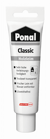 Der Ponal Holzleim Classic macht vielfältige Verleimungen schnell und zuverlässig möglich. So eignet sich der Holzleim optimal für Montageverleimungen (Dübel, Nut und Feder, Schlitz und Zapfen), Flächenverleimungen (Schichtpressstoffplatten, Hartfaserplatten o. Ä.) und auch für Fugenverleimungen und kann auch als Bastelleim ideal eingesetzt werden. Dabei überzeugt der transparent trocknende Weißleim mit seiner sehr hohen Verleimungsfestigkeit sowie seinen verfärbungs- und lösemittelfreien Eigenschaften. Der Holzkleber erfüllt nach DIN EN 204 die Beanspruchungsgruppe D2 und Kleber-Reste können anschließend leicht entfernt werden.