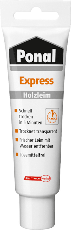 Mit dem Ponal Express Holzleim lassen sich vielfältige Verleimungen einfach umsetzen. Bei Montage-, Fugen-, Flächen-, Zargen- und Korpusverleimungen überzeugt der lösemittelfreie und transparent trocknende Weißleim mit seiner kurzen Abbindezeit von nur ca. 5 Minuten – verklebte Flächen können so schnell weiterverarbeitet und belastet werden. Auch beim Verleimen von Dübeln, Federn, Massivholzanleimern, Schichtpressstoffplatten und vielen weiteren Anwendungen* überzeugt der Leim als starker Holzkleber mit seiner hohen Verleimungsfestigkeit. Der Montagekleber ist wasserfest nach DIN EN 204/D2.