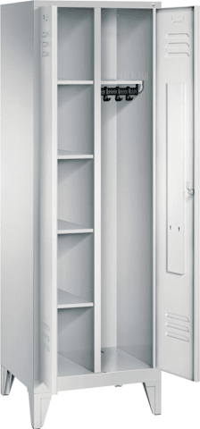 Linkes Abteil mit 4 Einlegeboden fest eingebaut, rechtes Abteil mit Ablageboden, Garderobenstange und 3 Schiebehaken.